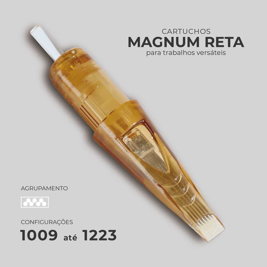 Os cartuchos Magnum são amplamente utilizados em tatuagens que exigem grandes preenchimentos com uniformidade e agilidade. São ideais para estilos como neo tradicional, old school e trabalhos em cores de grande escala, nos quais é necessário cobrir áreas extensas da pele de forma eficiente e com menor trauma.